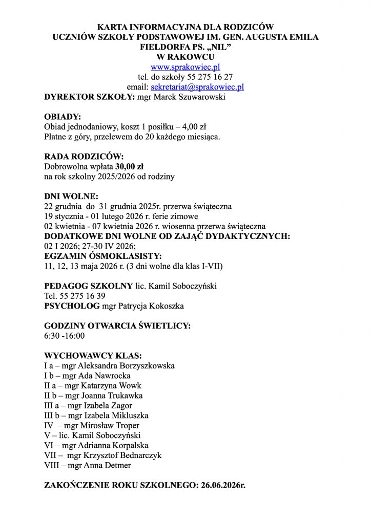 W związku z zaistniałą sytuacją epidemiczną Rada Pedagogiczna apeluje do rodziców, aby zapisywali do świetlicy szkolnej, tylko uczniów, którzy nie mają opieki w domu. Uczniowie, którzy nie są objęci opieką świetlicy zobowiązani są do przyjścia do szkoły nie wcześniej niż 5 minut przed planowanym rozpoczęciem zajęć i niezwłocznego opuszczenia szkoły bezpośrednio po zajęciach.